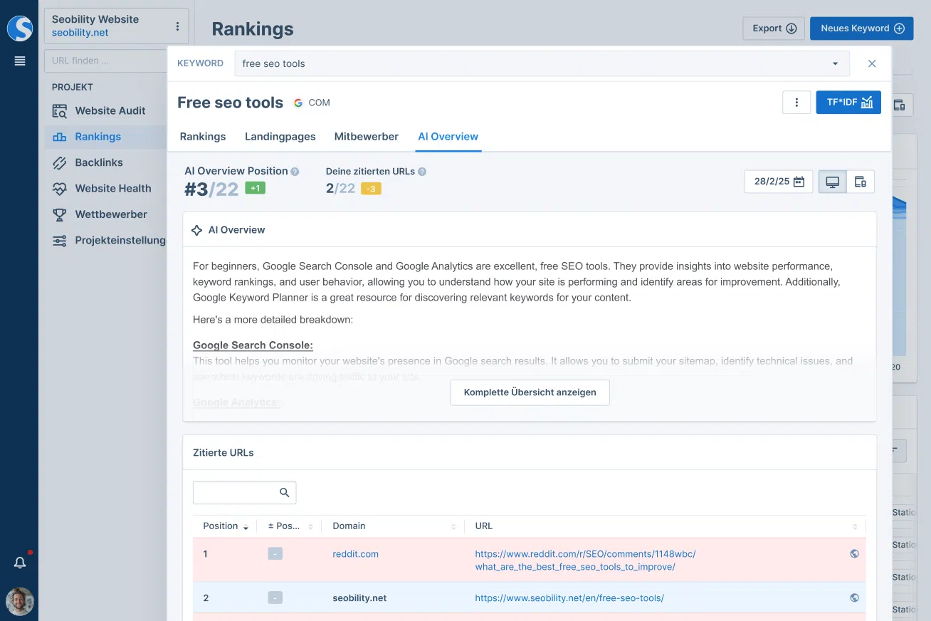 Ja. Seobility zeigt Dir klar, ob Deine Website enthalten ist und an welcher Position sie steht. Außerdem siehst Du den Text der AI Overview und kannst so prüfen, ob der Name Deiner Website bzw. Deines Unternehmens direkt erwähnt wird.