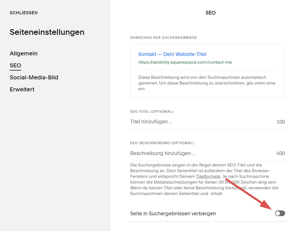 Squarespace hinkt Wix in Sachen SEO Funktionalität hinterher. Dennoch wirst Du hier auf jeden Fall in der Lage sein, eine ganze Reihe wichtiger Onpage Faktoren zu optimieren.